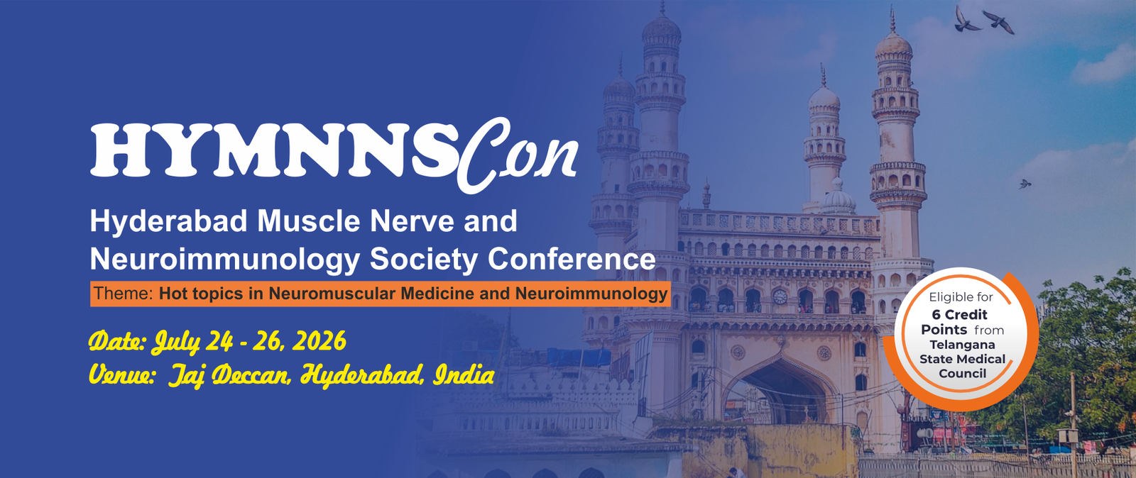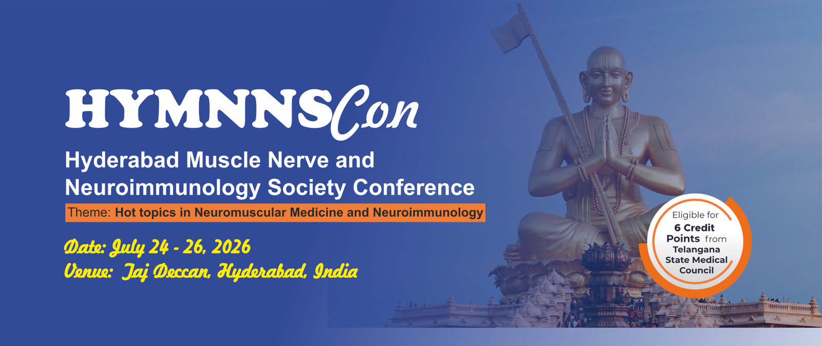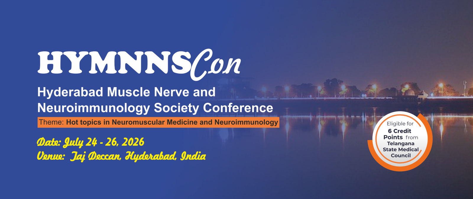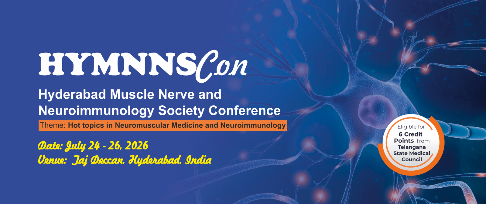 On behalf of the Steering Committee, it is with great pleasure that we extend a warm welcome to you to HyMNNScon – The Hyderabad Muscle, Nerve and Neuroimmunology Society Conference, scheduled to be held at the Taj Deccan, Hyderabad, from 24 to 26 July 2026.